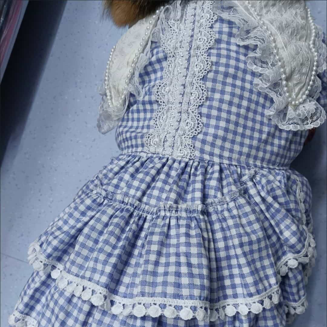 Customizable Blue Gingham Pet Dress with Lace Trim and Ruffles
