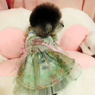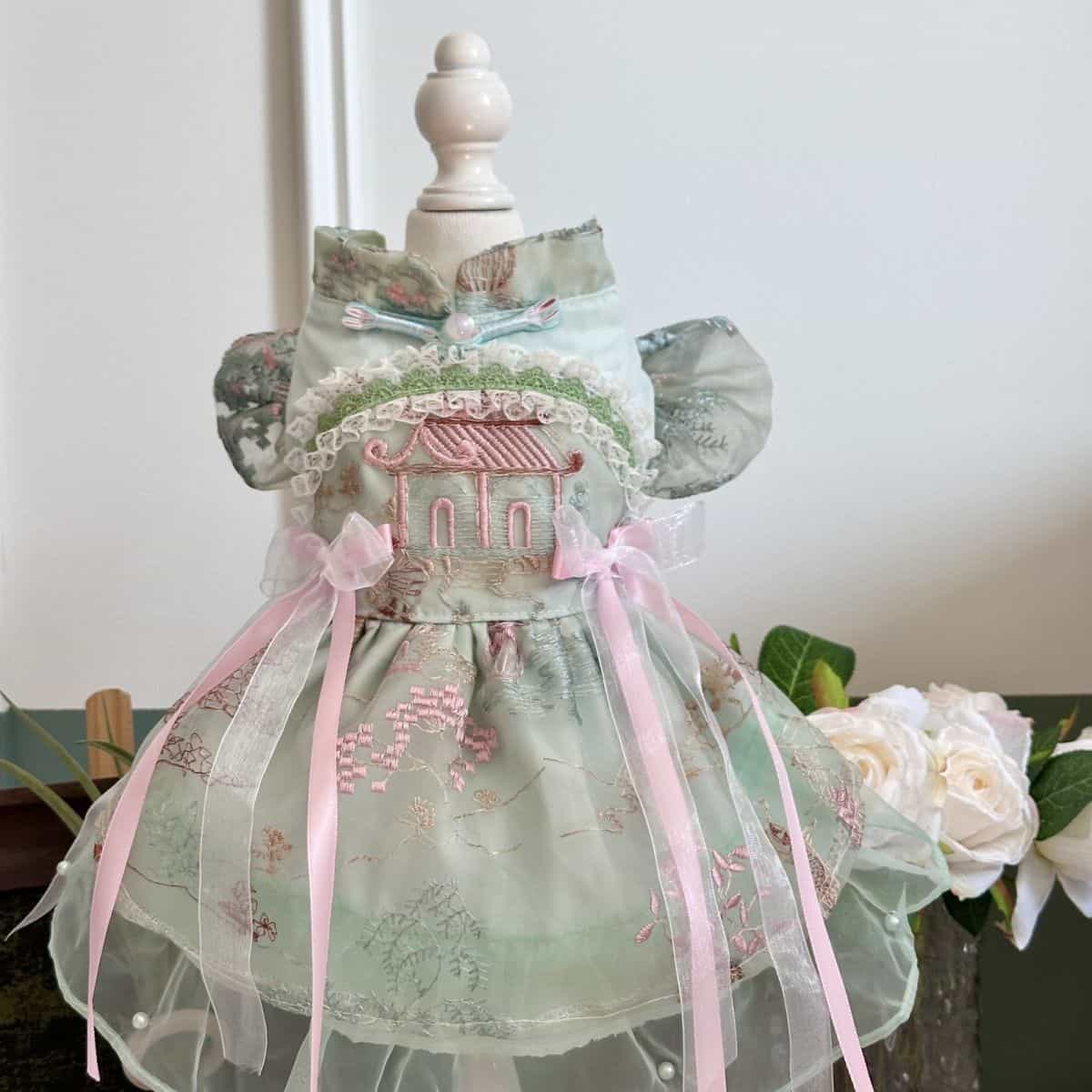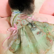 Customizable Elegant Green Pet Dress with Traditional Embroidery and Ribbons