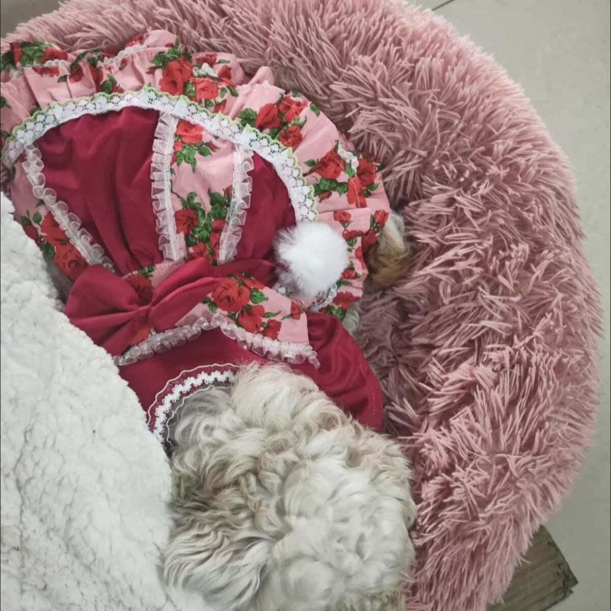 Customizable Floral Pink and Red Pet Dress with Fur Trim and Bow