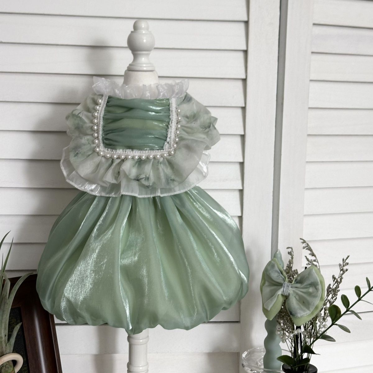 Customizable Mint Green Pet Dress with Ruffled Collar and Pearl Accents