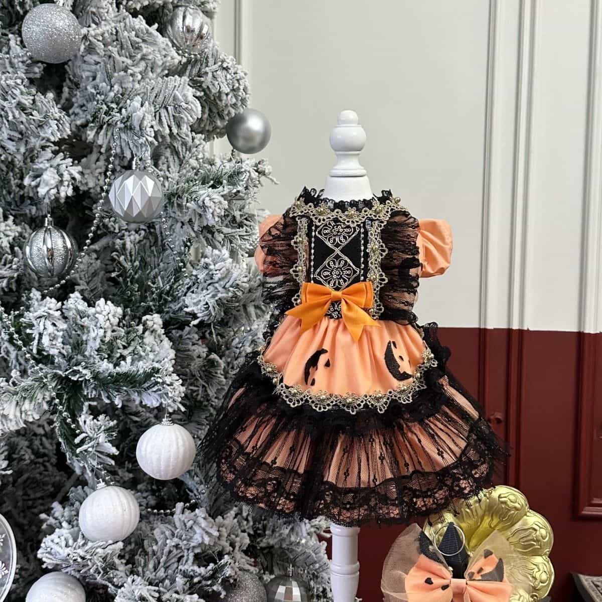 Customizable Spooky Pet Dress in Pumpkin Orange with Black Lace and Ghost Accents